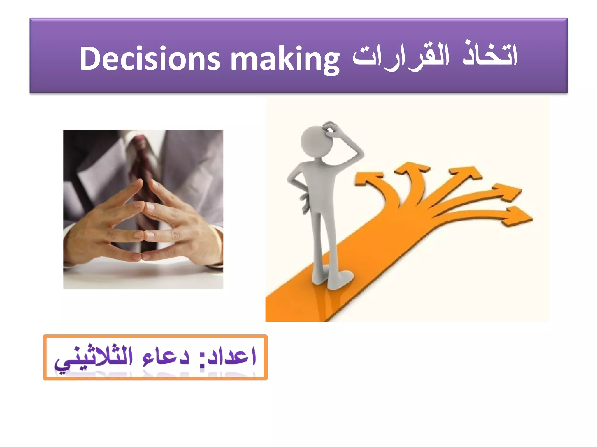تتعلق الوثيقة بعملية اتخاذ القرار والمتغيرات التي تؤثر في هذه العملية، حيث يعتمد القرار على المعلومات المتاحة والبيانات في ظل ظروف معينة. يتم تناول صعوبات اتخاذ القرار بسبب عدم اليقين والضبابية المحيطة بالخيارات والنتائج المحتملة. كما تسلط الضوء على أهمية المعرفة والتجارب الشخصية في تحسين جودة القرارات التي يتم اتخاذها في المنظمات.