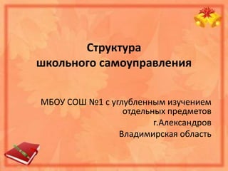 Документ описывает структуру школьного самоуправления в МБОУ СОШ №1 с углубленным изучением отдельных предметов в Александрове, Владимирская область, состоящую из трех уровней: классное, школьное и совет школы. Каждый уровень имеет свои органы и комитеты, выполняющие различные функции, такие как организация мероприятий, контроль за успеваемостью и представление интересов учащихся. Высшими органами самоуправления являются собрания учащихся и советы, обеспечивающие стратегическое планирование и взаимодействие с педагогическим составом и родителями.