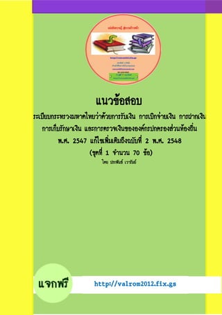 และการตรวจเงินขององค์กรปกครองส่วนท้องถิ่น พ.ศ. 2547 แก้ไขเพิ่มเติมถึงฉบับที่ 2 พ.ศ. 2548 (ชุดที่ 1 จานวน 70 ข้อ) โดย ประพันธ์ เวารัมย์ http://valrom2012.fix.gs