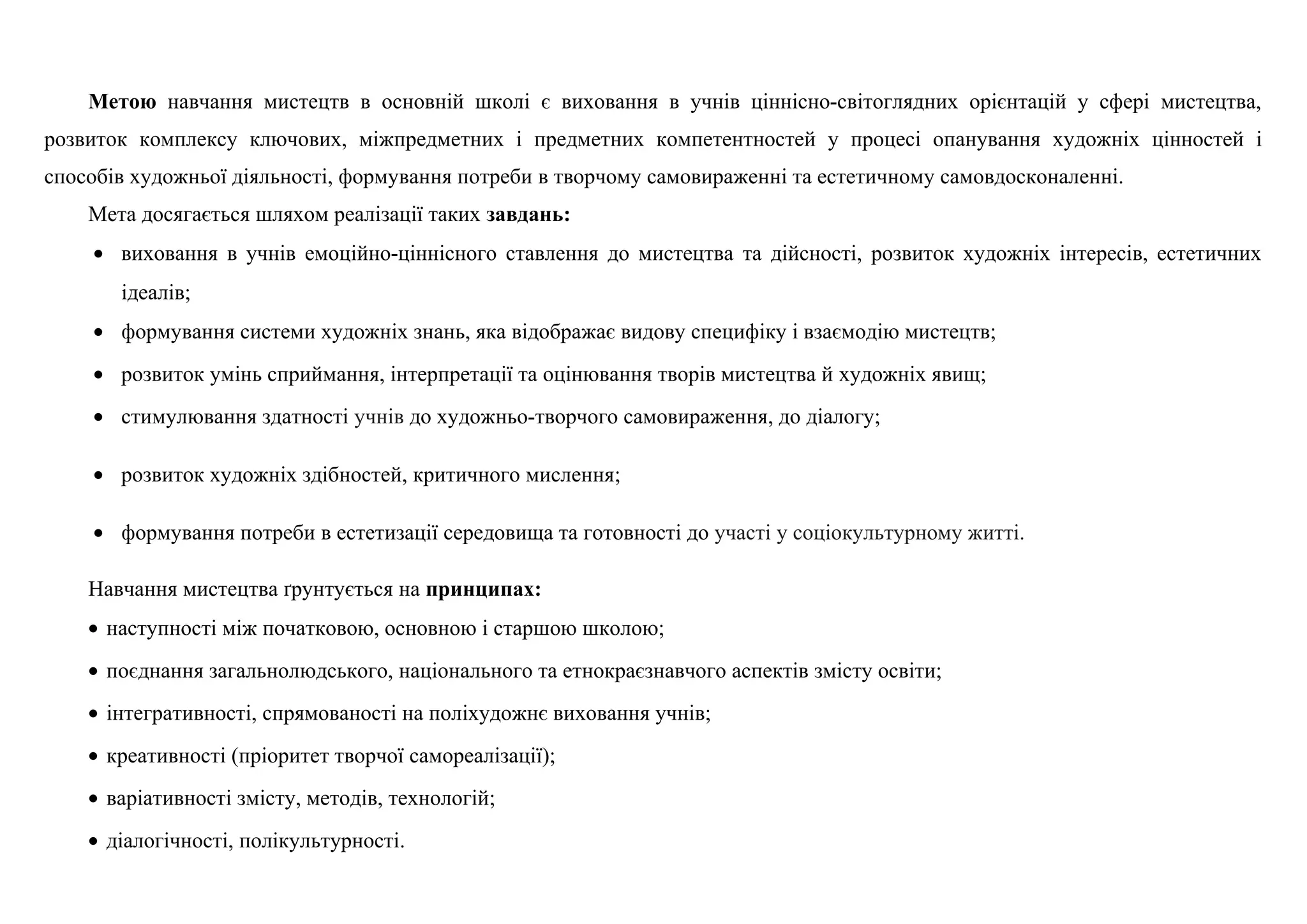 Метою навчання мистецтвв основній школі є виховання в учнів ціннісно-світоглядних орієнтацій у сфері мистецтва,