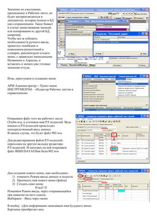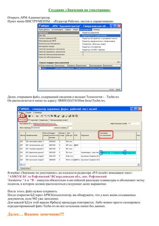 Документ описывает процесс создания значения по умолчанию в редакторе рабочего листа для библиографической базы данных с использованием ARM администратора. Он объясняет, как настроить и сохранить данные в поле 902, а также дает рекомендации по созданию меню для автоматизации ввода данных. Важно отметить, что значения по умолчанию не будут применены к ранее сохраненным документам.
