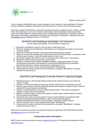 готелі, бази відпочинку ітд) та пункти прокату велосипедів повинні відповідати переліку критеріїв,