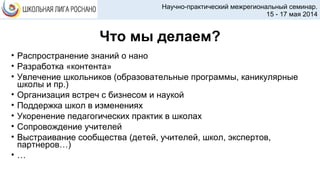 Документ описывает мероприятия научно-практического межрегионального семинара, проведенного в Санкт-Петербурге с 15 по 17 мая 2014 года, направленные на развитие образовательных программ, включая нанообразование. Основное внимание уделяется созданию региональных сетей, поддержке школ, учителей и школьников, а также сотрудничеству с бизнесом и наукой. Семинар также обсуждает вызовы и возможности, связанные с увеличением числа участников и обеспечением качества образовательного процесса.
