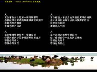 Isle Of Innisfree( 音樂演奏 ) 人 當你經過大千世界的洗禮而潔淨的時候 你才會感到消除污垢後的快慰和歡欣 雖然你不年輕 儘管你心平靜 人 當你回歸大地解甲歸田時 你才會明白你一生的真正意義 不管你是高官 不論你是百姓 人 當你來到世上的第一聲哭聲響起 你就被預示著將面臨種種痛苦和艱辛 不管你是否願意 不論你是否逃避 人 當你慢慢學會思考,學會分析 你就將被內心的矛盾所煎熬和充斥 不管你是偉人 不論你是貧民