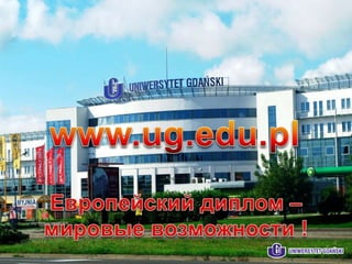 Гданьский университет, расположенный в Труймястоу на побережье Балтийского моря, предлагает 52 специальности и 182 специализации для 33 000 студентов и аспирантов. Университет обеспечивает гибкую программу обучения через болонскую систему и уникальные курсы, такие как логопедия и океанография, а также возможности стажировок и обмена в рамках программы Эразмус. Студенты могут участвовать в культурных и спортивных мероприятиях, а также проходить практику в сотрудничестве с более чем 200 компаниями.