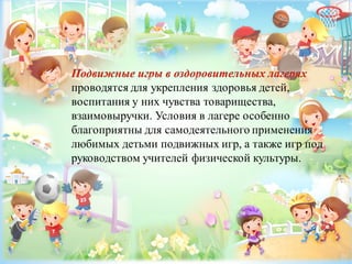 Подвижные игры играют ключевую роль в развитии ребенка, способствуя его физическому, интеллектуальному и эмоциональному росту. Они помогают улучшать природные навыки движений и воспитывают физические и моральные качества, такие как смелость и коллективизм. Кроме того, подвижные игры способствуют укреплению здоровья и нормальному физическому развитию детей.