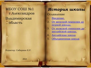 Документ рассказывает об истории школы №1 в Александрове, которая была основана в 1874 году как женская гимназия и позже была преобразована в различные учебные заведения до объединения с мужской гимназией в 1985 году. В течение своей долгой истории школа переживала сложности, включая войны и нехватку ресурсов, но также была известна своими выдающимися преподавателями и внедрением новых образовательных практик, таких как преподавание на английском языке. Объединенная школа сохранила традиции обеих предшествующих школ и была обновлена новым зданием, построенным в 1985 году.
