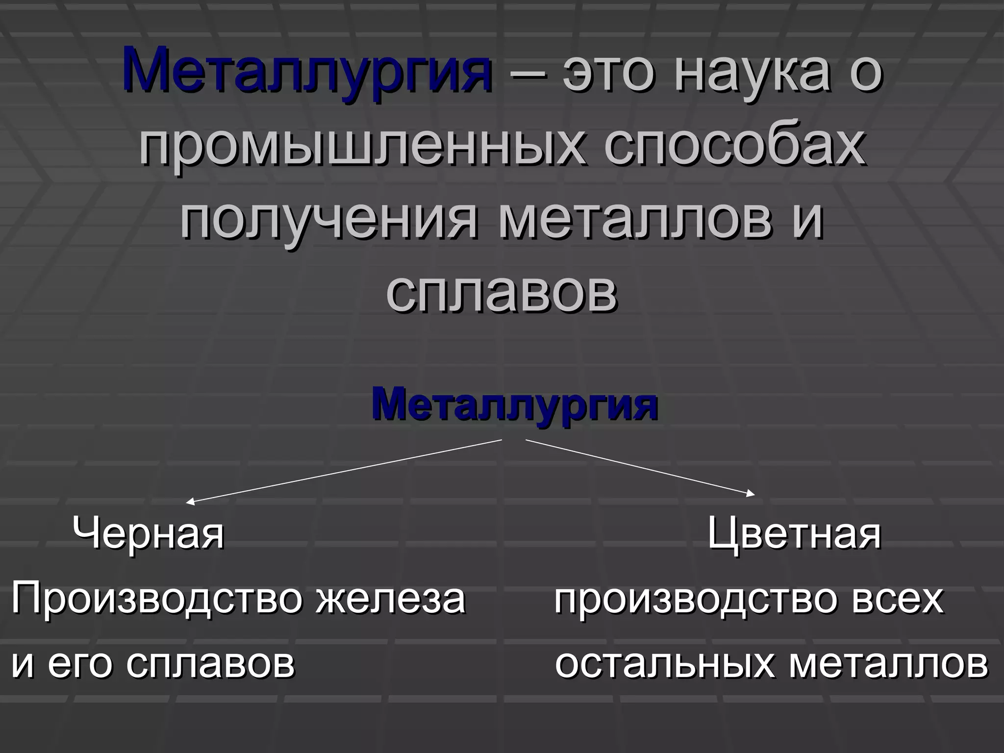 Документ представляет собой презентацию по металлургии, освещая методы получения металлов и сплавов. Основное внимание уделяется стадиям металлургических процессов, включая обогащение руд и химические превращения, а также технологии производства чугуна и стали. Также рассматриваются профессии, связанные с металлургическими производствами.