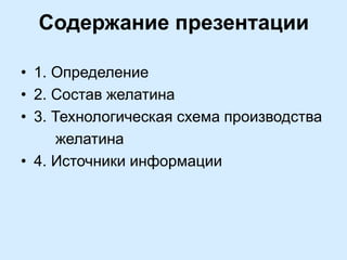 Документ представляет собой презентацию о желатине, включая его определение, состав и технологическую схему производства. Описаны этапы производства желатина, начиная от первичной обработки сырья и заканчивая упаковкой и хранением. Также указаны источники информации о пищевых добавках, связанных с желатином.