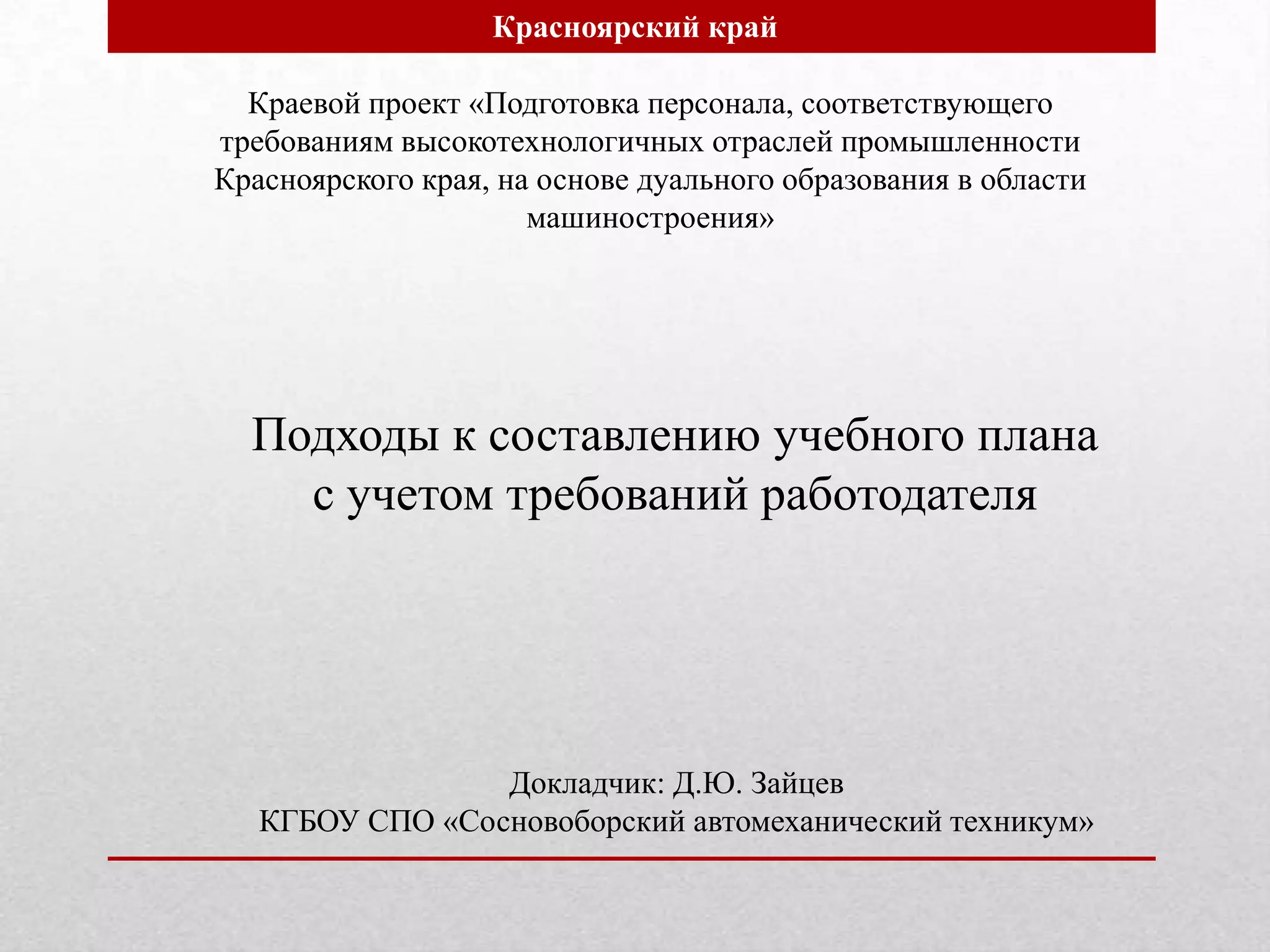 Документ описывает проект по подготовке квалифицированного персонала для высокотехнологичных отраслей Красноярского края через дуальное образование в области машиностроения. Основное внимание уделяется разработке учебных планов в соответствии с требованиями работодателей и Федеральных государственных образовательных стандартов (ФГОС) с акцентом на интеграцию новых дисциплин и практики. Включает шаги для формирования учебного плана, обеспечения материально-технической базы и согласования с работодателями.