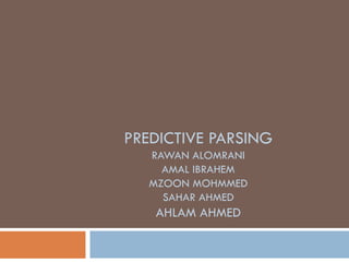This document discusses predictive parsing, a form of recursive-descent parsing where the next input symbol determines which production to use without backtracking. It transforms grammars by eliminating left recursion and left factoring to guarantee no backtracking. Predictive parsing is efficient but requires LL(1) grammars, and can create these grammars by removing left-recursion and left factoring.
