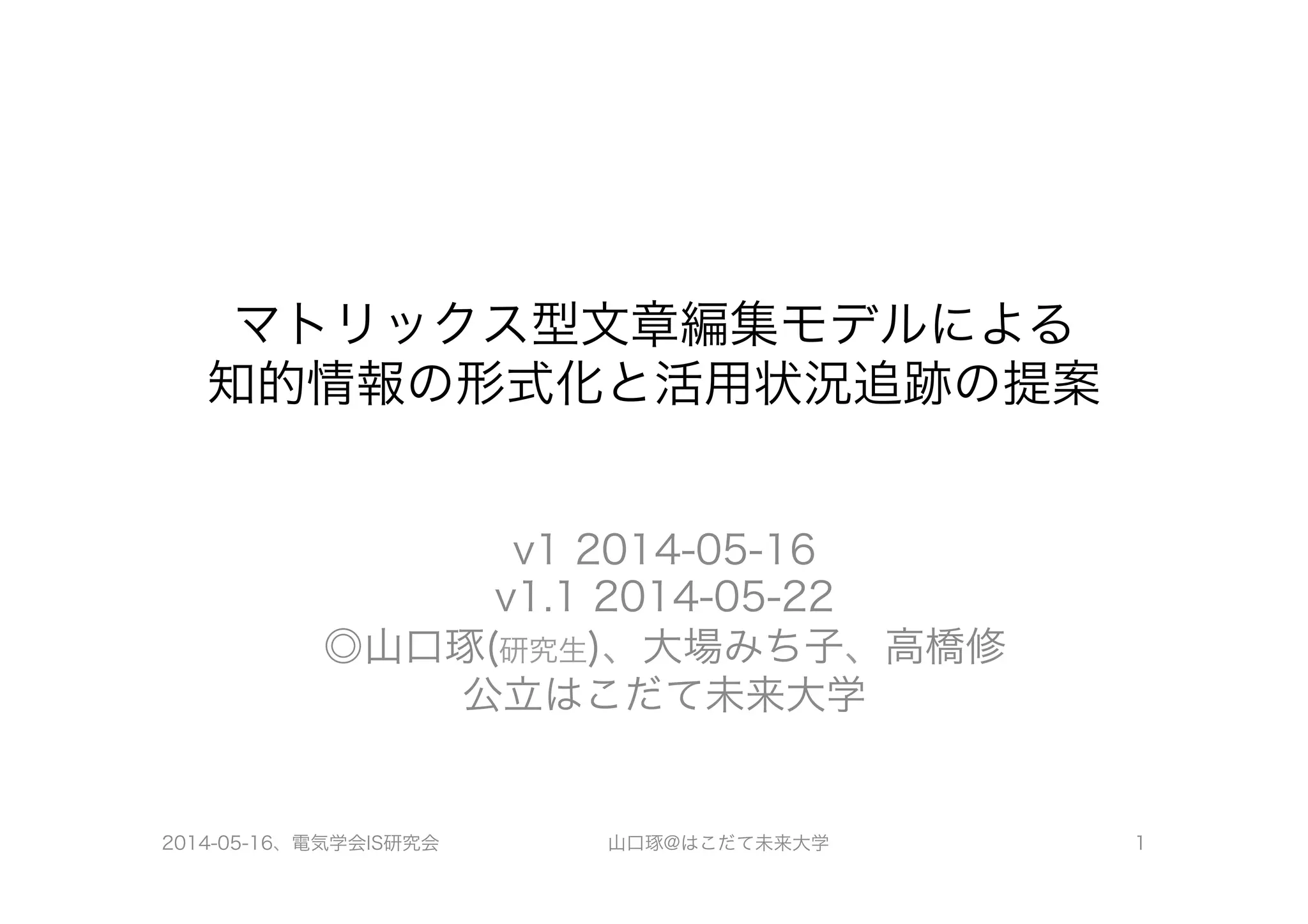 電気学会 第58回情報システム研究会 2014年05月16日(金) 「視点を可視化したデジタルドキュメントが促進するチーム活動」( http://www.slideshare.net/yamahige/ss-28722091 ) などの知識管理への応用。