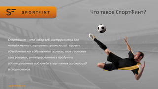 Спортфинт – это набор веб-инструментов для управления спортивными организациями, объединяющий сервисы и готовые решения для эффективного менеджмента. Сервис решает проблемы организации турниров, ведения статистики и монетизации аудитории, а также обеспечивает связь с коммерческими брендами. Проект ориентирован на успешное развитие более 15 000 спортивных организаций в России и требует инвестиций для дальнейшего роста.