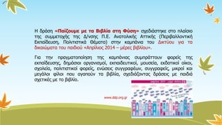 κε ηα Βηβιία ζηε Φύζε» ζρεδηάζηεθε ζην πιαίζην ηεο ζπκκεηνρήο ηεο Γ/λζεο Π.Δ. Αλαηνιηθήο Αηηηθήο (Πεξηβαιινληηθή Δθπαίδεπζε, Πνιηηηζηηθά Θέκαηα) ζηελ θακπάληα ηνπ Γηθηύνπ γηα ηα δηθαηώκαηα ηνπ παηδηνύ «Απξίιηνο 2014 – κέξεο βηβιίνπ». Γηα ηελ πξαγκαηνπνίεζε ηεο θακπάληαο ζπκπξάηηνπλ θνξείο ηεο εθπαίδεπζεο, δεκόζηνη νξγαληζκνί, εθπαηδεπηηθνί, κνπζεία, εθδνηηθνί νίθνη, ζρνιεία, πνιηηηζηηθνί θνξείο, ελώζεηο ζπγγξαθέσλ, ζπγγξαθείο, κηθξνί θαη κεγάινη θίινη πνπ αγαπνύλ ηα βηβιία, ζρεδηάδνληαο δξάζεηο κε παηδηά ζρεηηθέο κε ην βηβιίν. www.ddp.org.gr