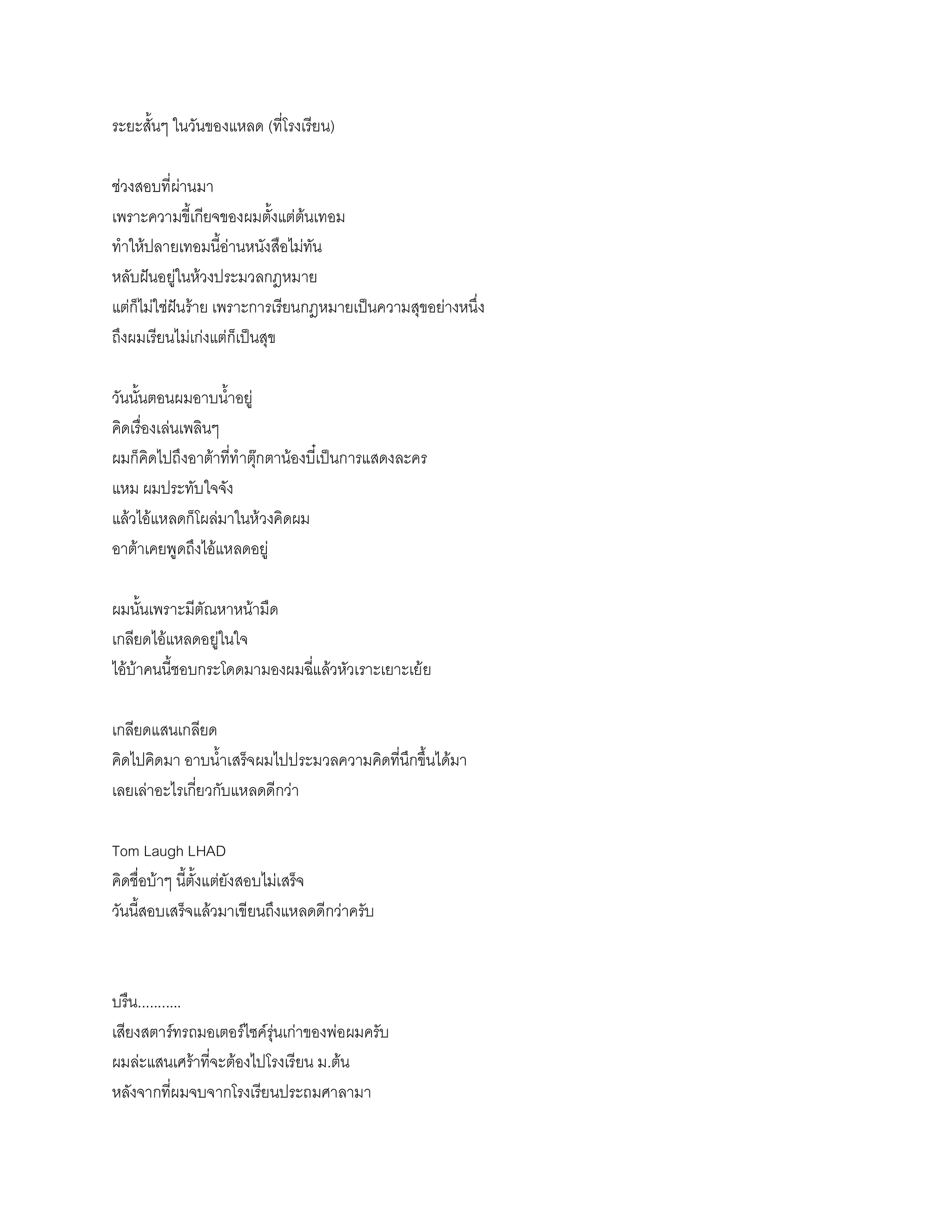 เพราะการเรียนกฎหมายเป็นความสุขอย่างหนึ่ง ถึงผมเรียนไม่เก่งแต่ก็เป็นสุข วันนั้นตอนผมอาบน้าอยู่ คิดเรื่องเล่นเพลินๆ ผมก็คิดไปถึงอาต้าที่ทาตุ๊กตาน้องบี๋เป็นการแสดงละคร แหม ผมประทับใจจัง แล้วไอ้แหลดก็โผล่มาในห้วงคิดผม อาต้าเคยพูดถึงไอ้แหลดอยู่ ผมนั้นเพราะมีตัณหาหน้ามืด เกลียดไอ้แหลดอยู่ในใจ ไอ้บ้าคนนี้ชอบกระโดดมามองผมฉี่แล้วหัวเราะเยาะเย้ย เกลียดแสนเกลียด คิดไปคิดมา อาบน้าเสร็จผมไปประมวลความคิดที่นึกขึ้นได้มา เลยเล่าอะไรเกี่ยวกับแหลดดีกว่า Tom Laugh LHAD คิดชื่อบ้าๆ นี้ตั้งแต่ยังสอบไม่เสร็จ วันนี้สอบเสร็จแล้วมาเขียนถึงแหลดดีกว่าครับ บรืน........... เสียงสตาร์ทรถมอเตอร์ไซค์รุ่นเก่าของพ่อผมครับ ผมล่ะแสนเศร้าที่จะต้องไปโรงเรียน ม.ต้น หลังจากที่ผมจบจากโรงเรียนประถมศาลามา