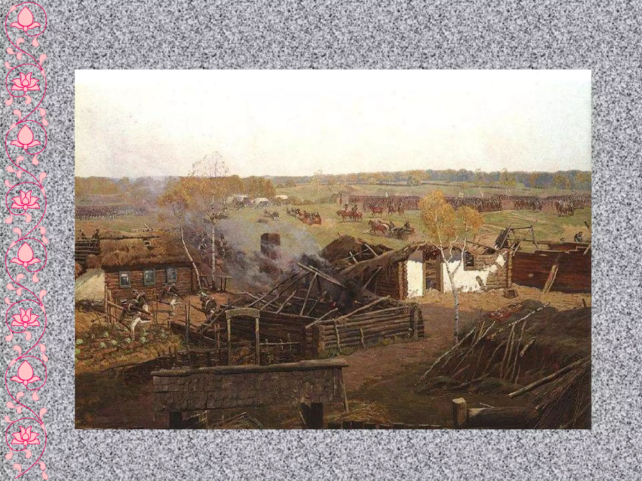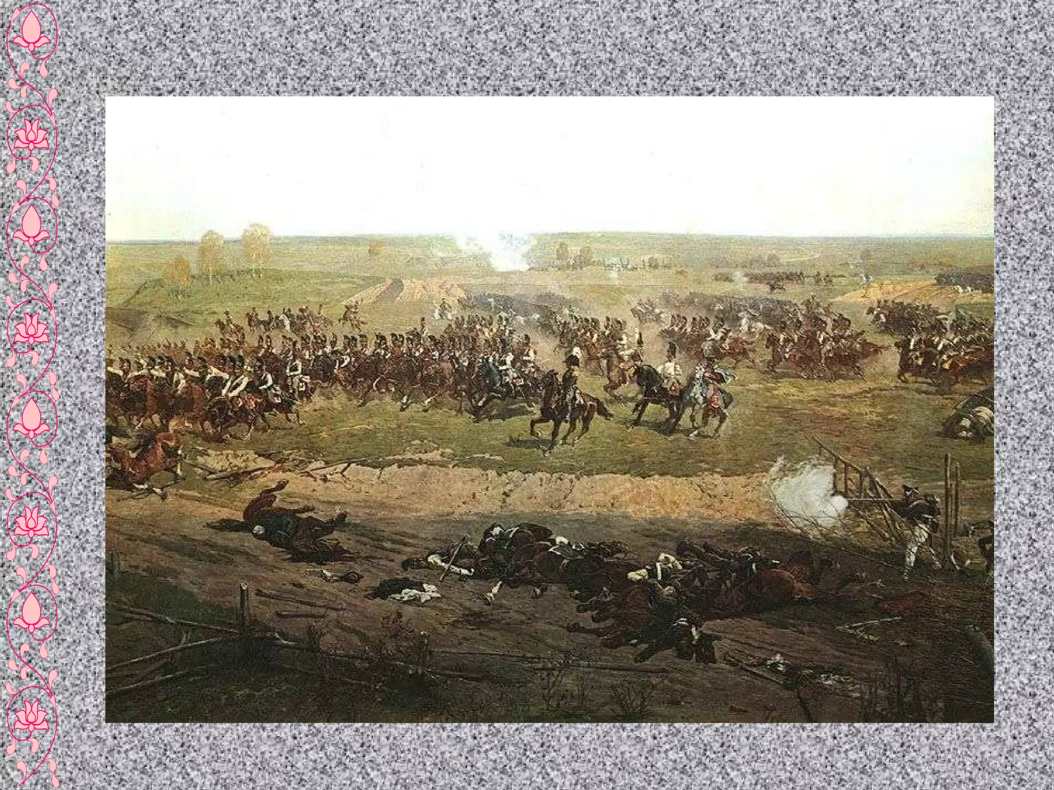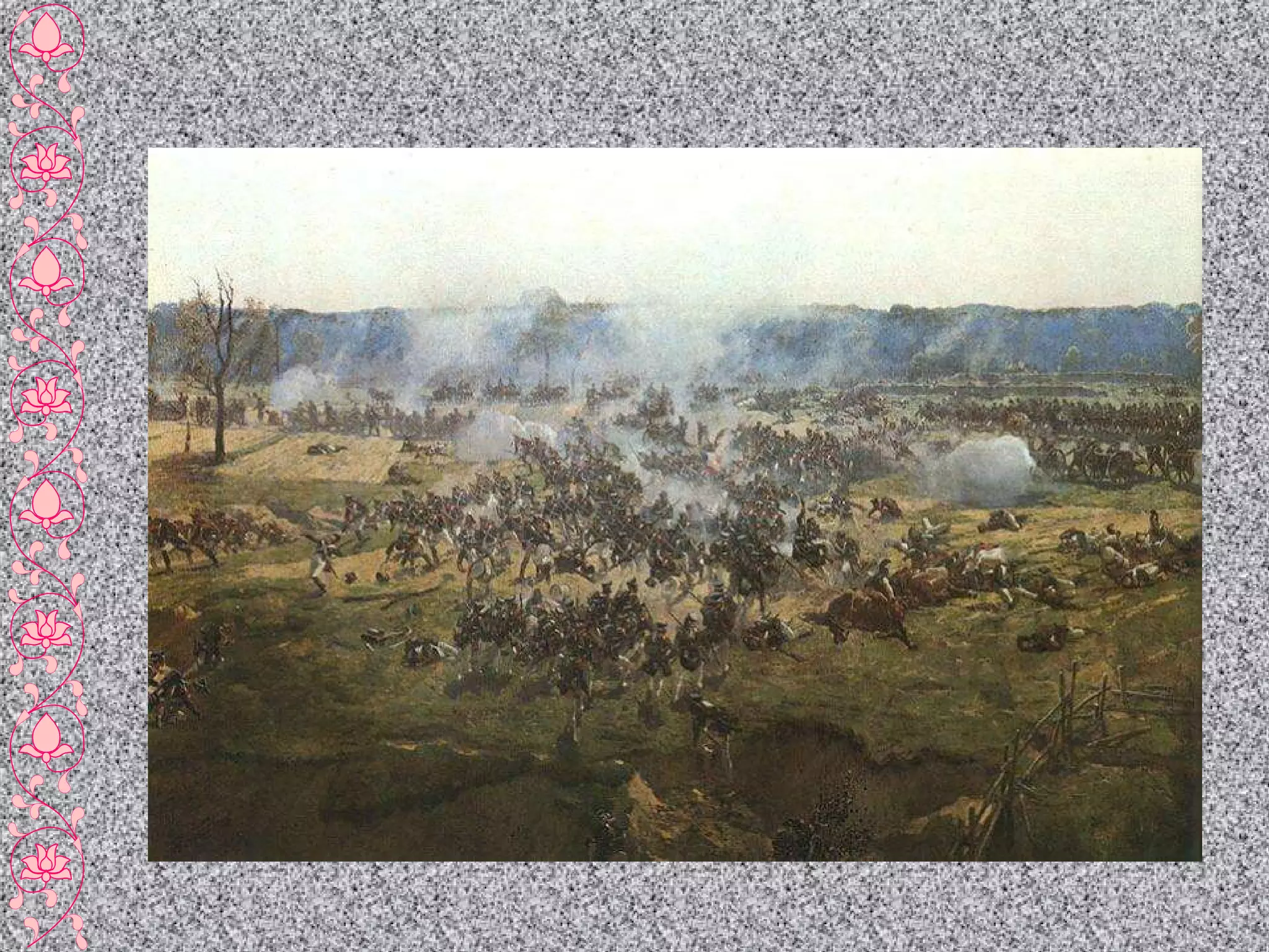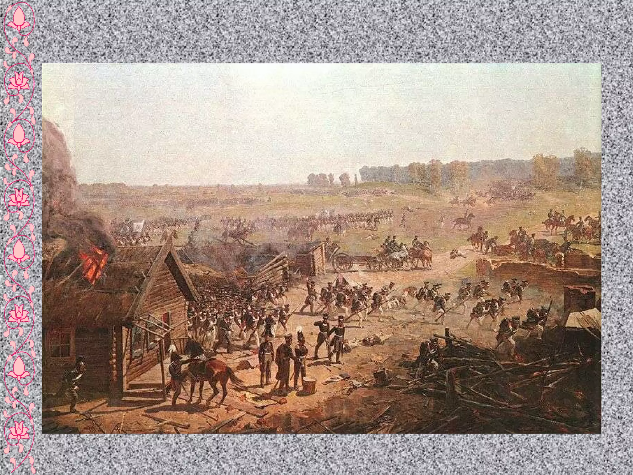 Документ посвящен бородинской битве 1812 года между русскими и французскими армиями. Описываются действия генерала Кутузова и Наполеона, а также представлены художественные репродукции, связанные с битвой и ее историческим контекстом. Упоминаются памятники и произведения искусства, посвященные важным событиям и личностям этого сражения.