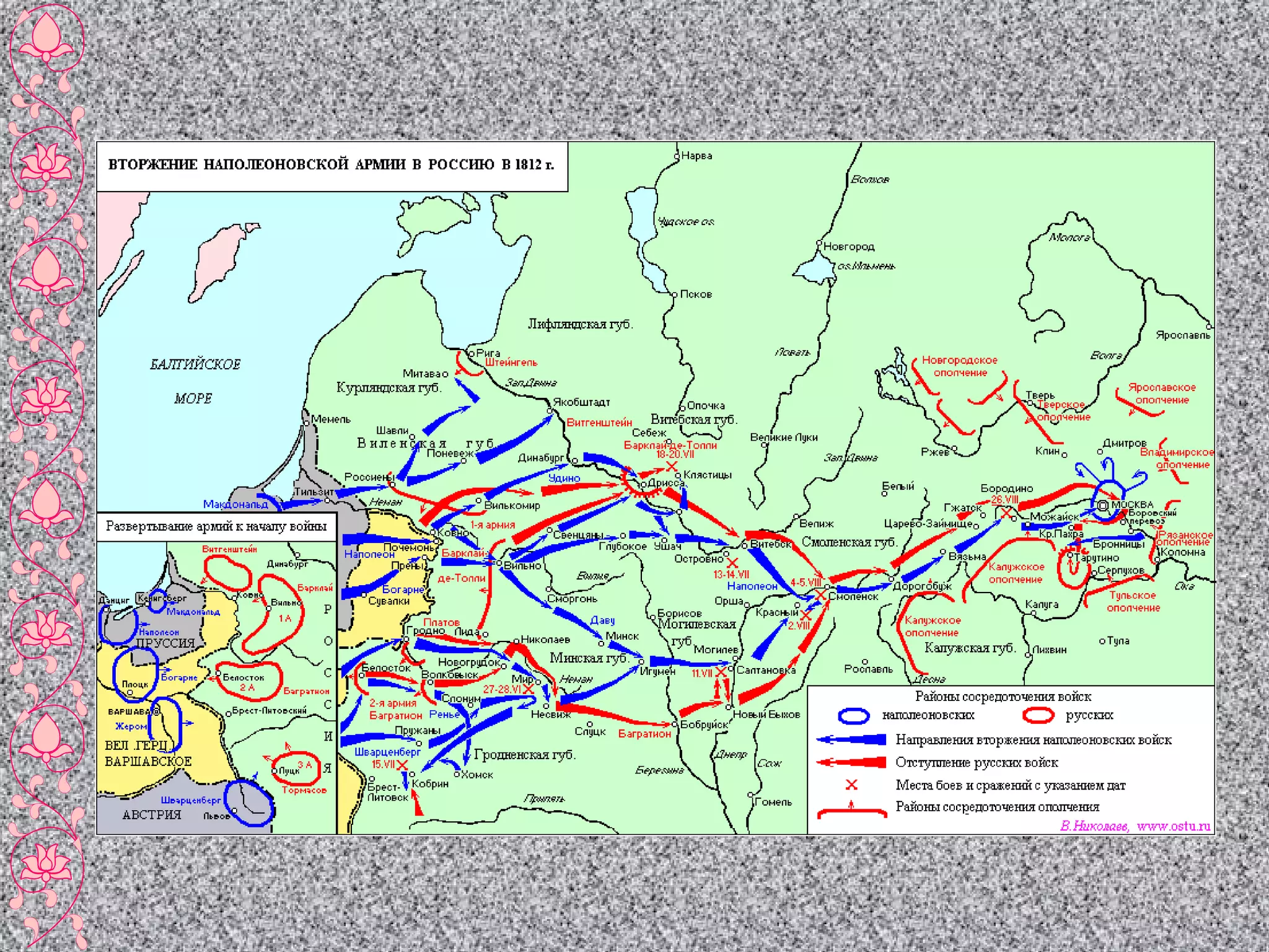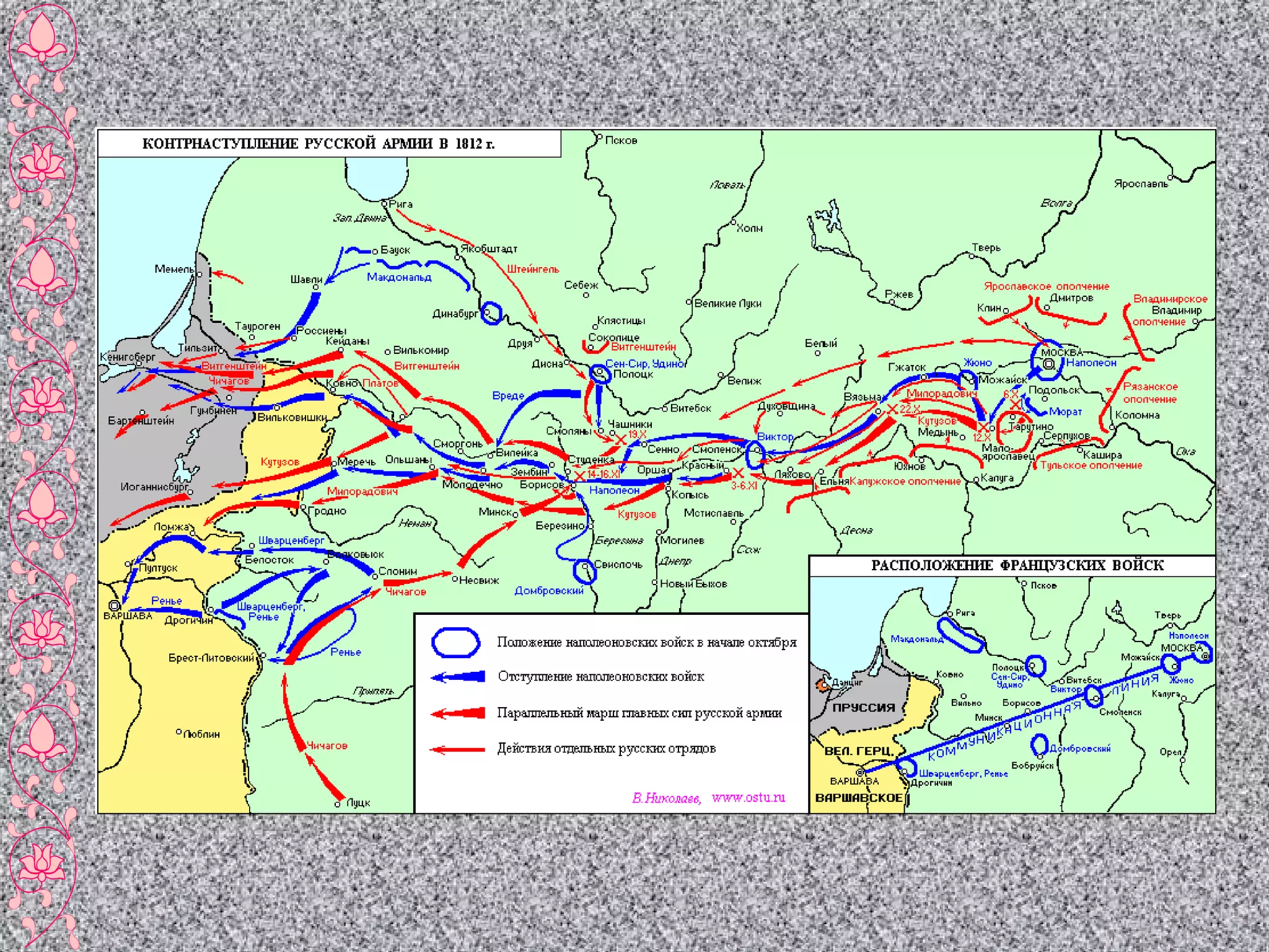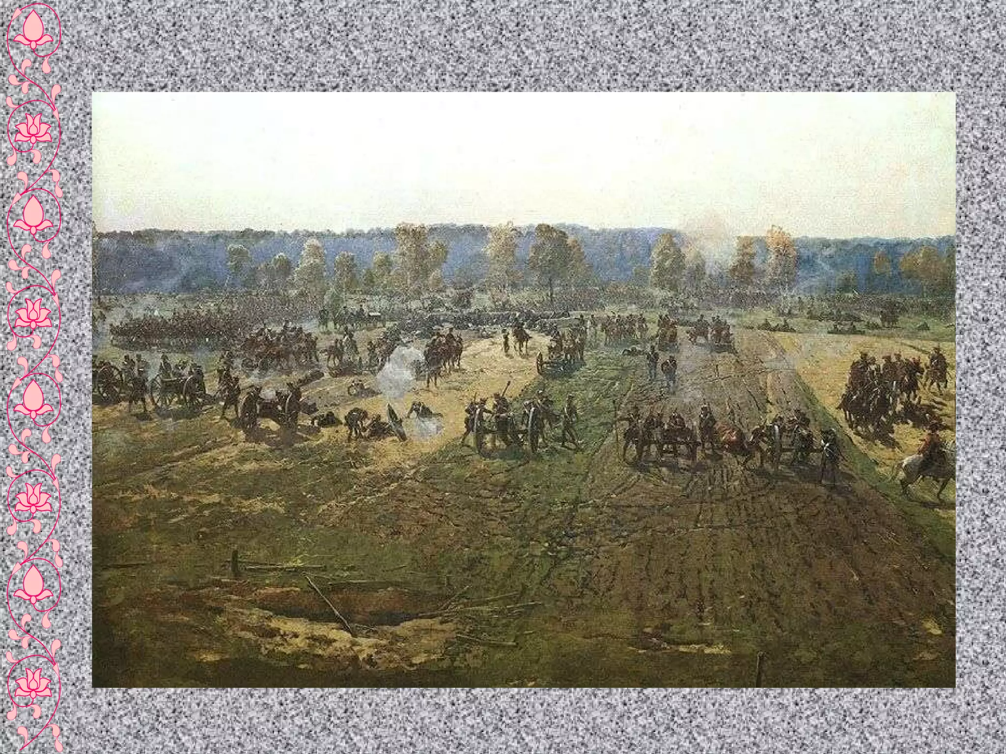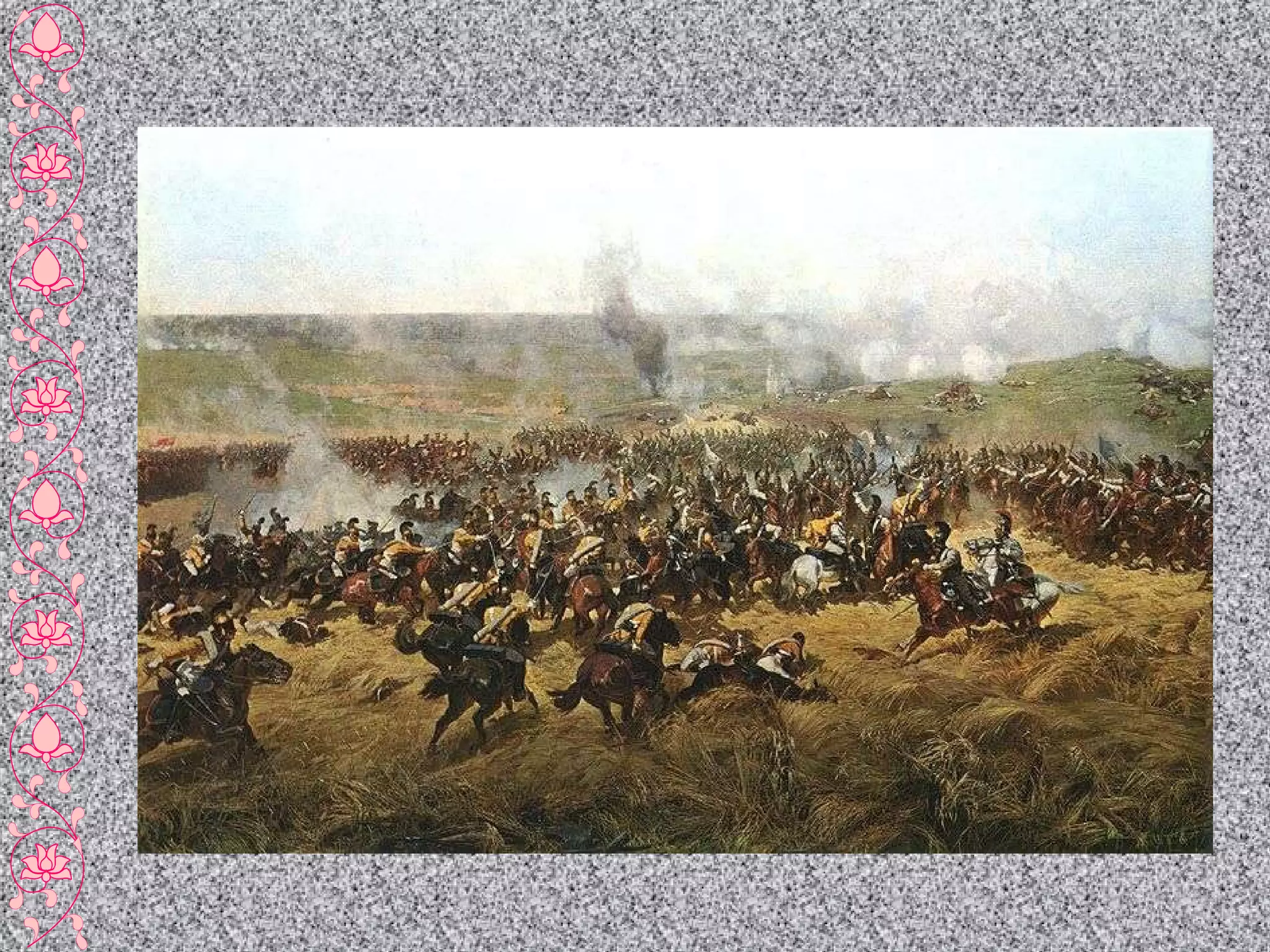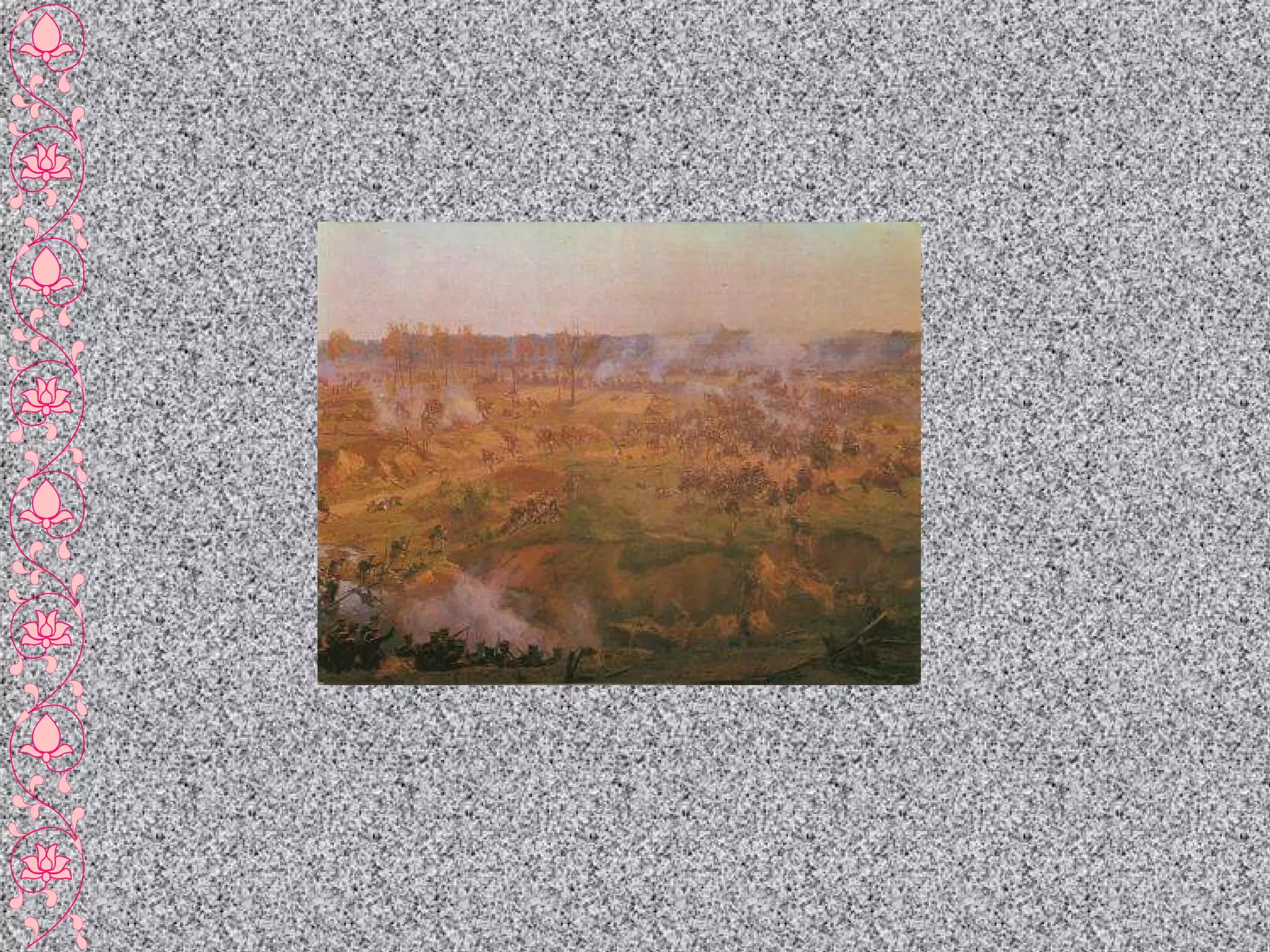 Документ посвящен бородинской битве 1812 года между русскими и французскими армиями. Описываются действия генерала Кутузова и Наполеона, а также представлены художественные репродукции, связанные с битвой и ее историческим контекстом. Упоминаются памятники и произведения искусства, посвященные важным событиям и личностям этого сражения.