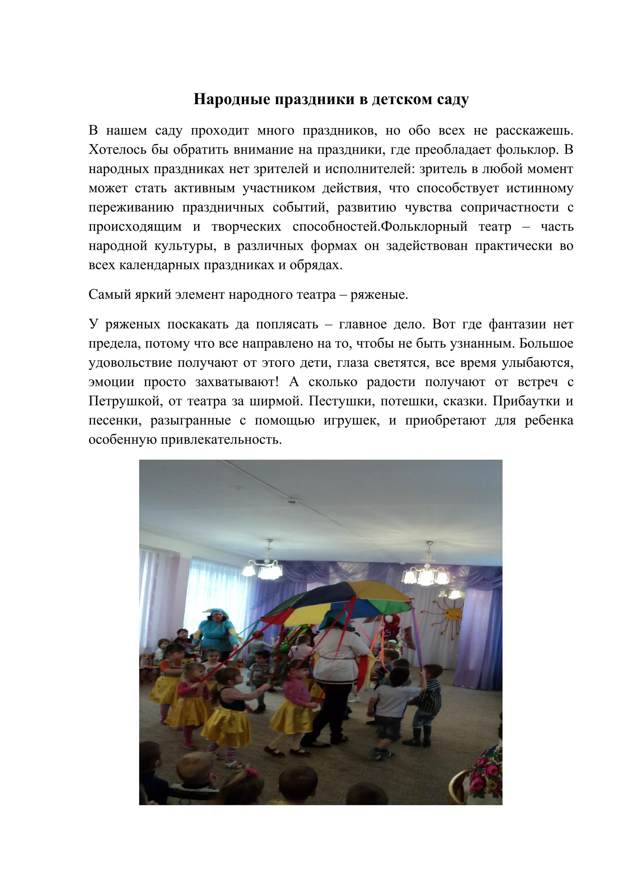 Документ описывает народные праздники, проводимые в детском саду, с акцентом на фольклор как важную часть детского воспитания. Участие детей в праздниках способствует их эмоциональному развитию и укрепляет связь между разными возрастными группами. Праздники, такие как колядки и масленица, охватывают народные традиции и создают атмосферу радости и единства в коллективе.
