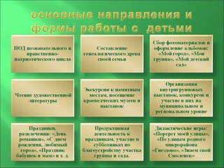 Документ описывает проблемы современных детей, включая забывание русской народной культуры и недостаток патриотического воспитания. Обсуждается важность формирования контактов между поколениями и воспитания уважения к традициям, истории и людям старшего поколения. В результате проведенных мероприятий наблюдается рост познавательной активности и патриотических чувств у детей.