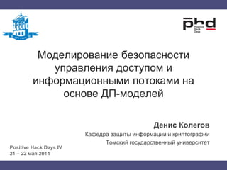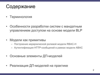 Документ обсуждает моделирование безопасности управления доступом и информационными потоками, включая различные модели, такие как дискреционное, мандатное, ролевое и атрибутное управление доступом. Рассматриваются важные элементы моделей, их реализация на практике и недостатки существующих подходов. Также обсуждаются примеры скрытых каналов и способы их использования для передачи информации в системах безопасности.