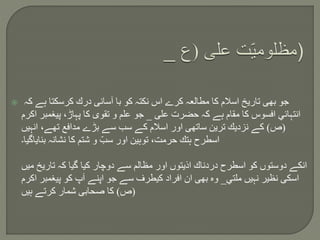 يتناول المستند تاريخ الإسلام والتحديات التي واجهها النبي محمد (ص) وأصحابه، مع التأكيد على مظالمهم وآلامهم. كما يتحدث عن بعض الشخصيات التاريخية مثل علي (ع) ومعاوية ودورهم في تلك الأحداث. يتضمن المستند مرجعيات تاريخية لتحقيق مصداقية المعلومات المذكورة.