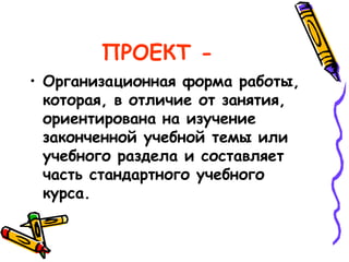 Документ описывает проектное обучение на уроках английского языка как организационную форму, стремящуюся к изучению законченных тем и развитию учащихся. Приведены типы проектов, их цели и преимущества, такие как повышение уверенности и развитие командных навыков. Также перечисляются ресурсы и успешные примеры проектов, реализованных в разных классах.