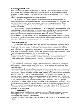 Документ обсуждает важные аспекты воспитания дочери-подростка, включая изменения в ее организме, влияние гормонов на эмоциональное состояние и социализацию. Родителям рекомендуется поддерживать открытость и доверие в общении, обеспечивая сбалансированный подход к оценке ее достижений и внешности. Также подчеркиваются важность участия девочки в спортe и исследовании интересов, а также необходимость предостережения о потенциальных опасностях в отношениях.