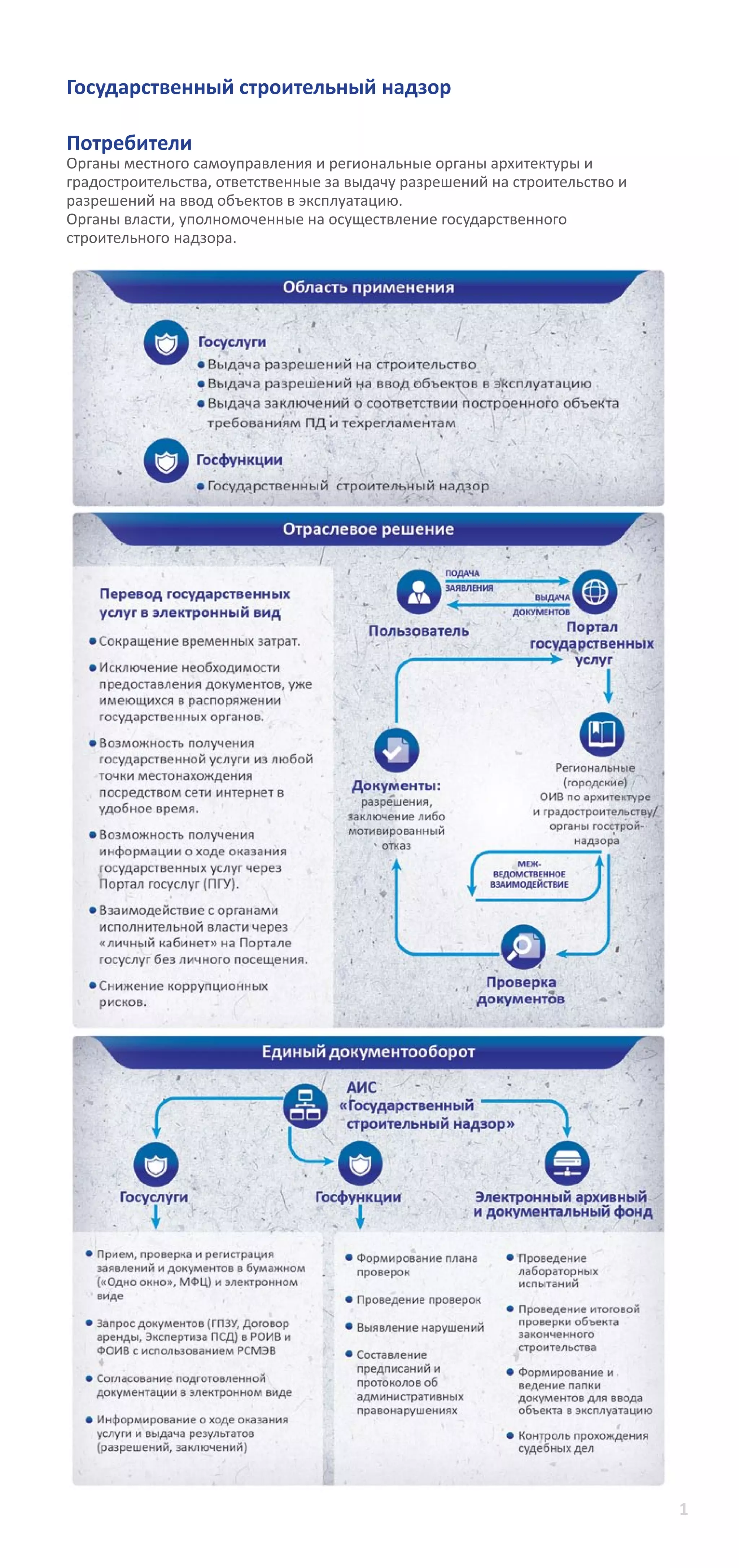 Документ описывает автоматизацию государственного строительного надзора и процесс выдачи разрешений на строительство, включая регистрацию заявлений и контроль их выполнения. Он включает функции по планированию проверок, ведению реестров, оцифровке документов и аналитике, что улучшает взаимодействие между органами власти и заявителями. Система внедрена в Комитете государственного строительного надзора города Москвы и охватывает полную документацию и контроль за строительной деятельностью.