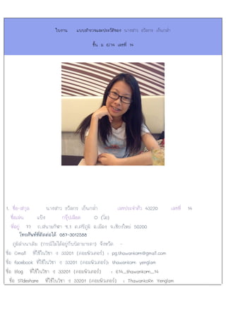 ใบงาน แบบสำรวจและประวัติของ นางสาว ธวัลรัตน์ ทาอ้าย