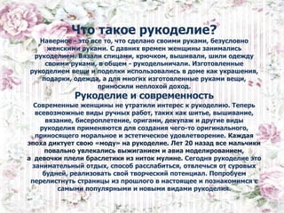 Документ описывает различные виды рукоделия, акцентируя внимание на их историческом развитии и популярности среди женщин. Среди упомянутых техник - бисероплетение, вязание, вышивка, пэчворк и декупаж, каждая из которых имеет уникальные особенности и практическое применение. Также рассматриваются новейшие направления рукоделия, такие как пейп-арт и карточки киригами, подчеркивающие творческий подход к ручной работе.