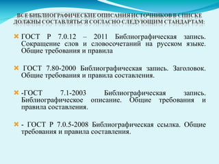 Документ содержит описание государственных стандартов (ГОСТ), регулирующих библиографические записи и ссылки, включая общие требования к составлению и применению. Приведены примеры различных типов документов, таких как книги, статьи и электронные ресурсы, а также рекомендации по оформлению заголовков и ссылок. Стандарт охватывает также правила описания электронных ресурсов, как локальных, так и удаленных, с указанием необходимых системных требований.