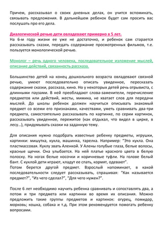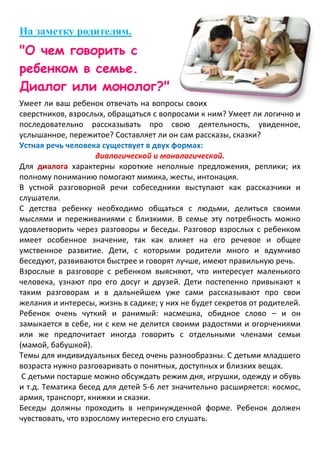 Документ содержит рекомендации для родителей о том, как развивать устную речь детей через диалог и беседы. Он подчеркивает важность общения в семье для развития логического мышления и способности к последовательному изложению мыслей. Также предлагаются различные темы для разговоров с детьми в зависимости от их возраста и советы по созданию благоприятной обстановки для общения.