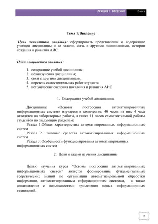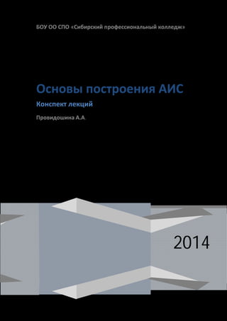 Документ представляет собой конспект лекций по курсу 'Основы построения автоматизированных информационных систем' в Сибирском профессиональном колледже. Он описывает содержание дисциплины, цели изучения, связи с другими областями знаний, а также задачи, связанные с самостоятельной работой студентов и историей развития автоматизированных информационных систем. Лекции подробно рассматривают основные понятия и задачи автоматизации и ее влияние на управление и обработку информации.
