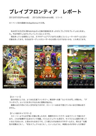 ブレイブフロンティア レポート 2013/07/03[iPhone版] 2013/09/30[Android版] リリース ! ※1ページ目の画像のみAppStoreより引用。 ! ! 私は2014/5/23に㈱HatchUpさん主催の勉強会をきっかけにブレフロをプレイしはじめまし た。今は手探りしながらプレイしているところです。 現在持っている感想としては、スマホゲームアプリながらも割とコンシューマーのゲームに近い 印象を持ってます。その点がターゲットのユーザーの心を惹いたのではないかな、とも考えてます。 ! ! 【ストーリー】 話の内容としては、よくある王道ファンタジー。異世界への扉「ルシウスの門」が開かれ、「グ ランガイア」という力を手にするために冒険が始まる。 画像には大々的にうたい文句が出てますが、ストーリーはあまり覚えていないほど印象はあり ません。 ! 【ドット絵のキャラクター】 ストーリーよりもまず強い印象に残ったのが、戦闘中のキャラクターは全てドットで描かれて おり、これが結構作り込まれていて奇麗。バトルエフェクトも多彩で、キャラごとに固有で持って いるんではないか、と思わされるほどです。こう感じたのは他のスマホゲームだと、例えば「光属 性の攻撃はこれ!」「切るエフェクトはこれ!」といったように、単調なものが多かった印象が