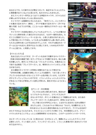 あるからです。ただ鮮やかさが際立つせいで、後述するバトルシステム に悪影響が出ているように見えます。私だけかもしれませんが。 またファンタジーRPGによく出てくる神話のキャラや、スライムなど が親しみやすさを出していると思われます。 キャラクターは戦闘中に手に入れるか、「絆ポイント」というポイン トを集めて回すガチャ(無料)、ダイヤを集めて回すガチャ(ダイヤは 購入可能)などで入手可能。ここらへんは一般的なスマホゲームと一緒 ですね。 キャラクターの成長は強化してレベルを上げていく、レベルが最大ま でいったら素材を使って進化させられるなど、もはや一般的な流れ。た だここに冒頭でコンシューマーに近いな、と感じた部分がありました。 レア度の低いキャラであれ、レベルを上げる速度が少し遅い気がします。 もちろん効率の良い上げ方はあるのでしょうが、それでも最近のカード ゲームに比べれば少し苦労するように感じてます。いわゆるポチポチ ゲームと違うな、と実感してます。 【バトルシステム】 先ほど出たバトルですが、ターゲットを決めて攻撃するキャラクター (写真3枚目の画面下部)をタップすることで攻撃できます。他にも敵 を攻撃したり、倒すことで手に入る「バトルクリスタル」を集めること で放てる必殺技「ブレイブバースト」は、専用のカットインが入って迫 力があります。 また複数のキャラクターが同時に攻撃を当てることで発生する 「SPARK攻撃」は強敵を攻略していく上では重要で、うまく狙ってタッ プしていかなければいけないことでゲーム性が増しています。ただポチ ポチとやっていってもいいのですが、こういったちょっとしたシステム があることで自らが参加している感じが得られ、飽きさせないようになっ ている。 【アリーナ・村の開発】 ブレフロには対人戦もあります。残念なが らリアルタイムでもなく、コマンド入力もで きないのですが、ポイントを集めることで報酬もあります。また他の プレイヤーのパーティも見れるので、参考にもなります。 そして戦うだけがRPGじゃない、とばかりに自分のいる村も開発で きたりします。こちらはバトルで得られる「カルマ」を消費することで、 村のあちらこちらから素材を集めることができたり、アイテムを合成で きたりできるようになります。クエストにいくスタミナが無くても、村の開発をしたり、アリー ナバトルをすることでちょっとした 間時間をつぶせるのも、このゲームのポイントの一つです。 ! 主にターゲットとなっている(と思われる)30代にとって、戦闘にちょっとしたテクニックが 必要だったり、ドット絵だったり、ファンタジーだったり、こういった要素が多く含まれていての めり込みやすい。