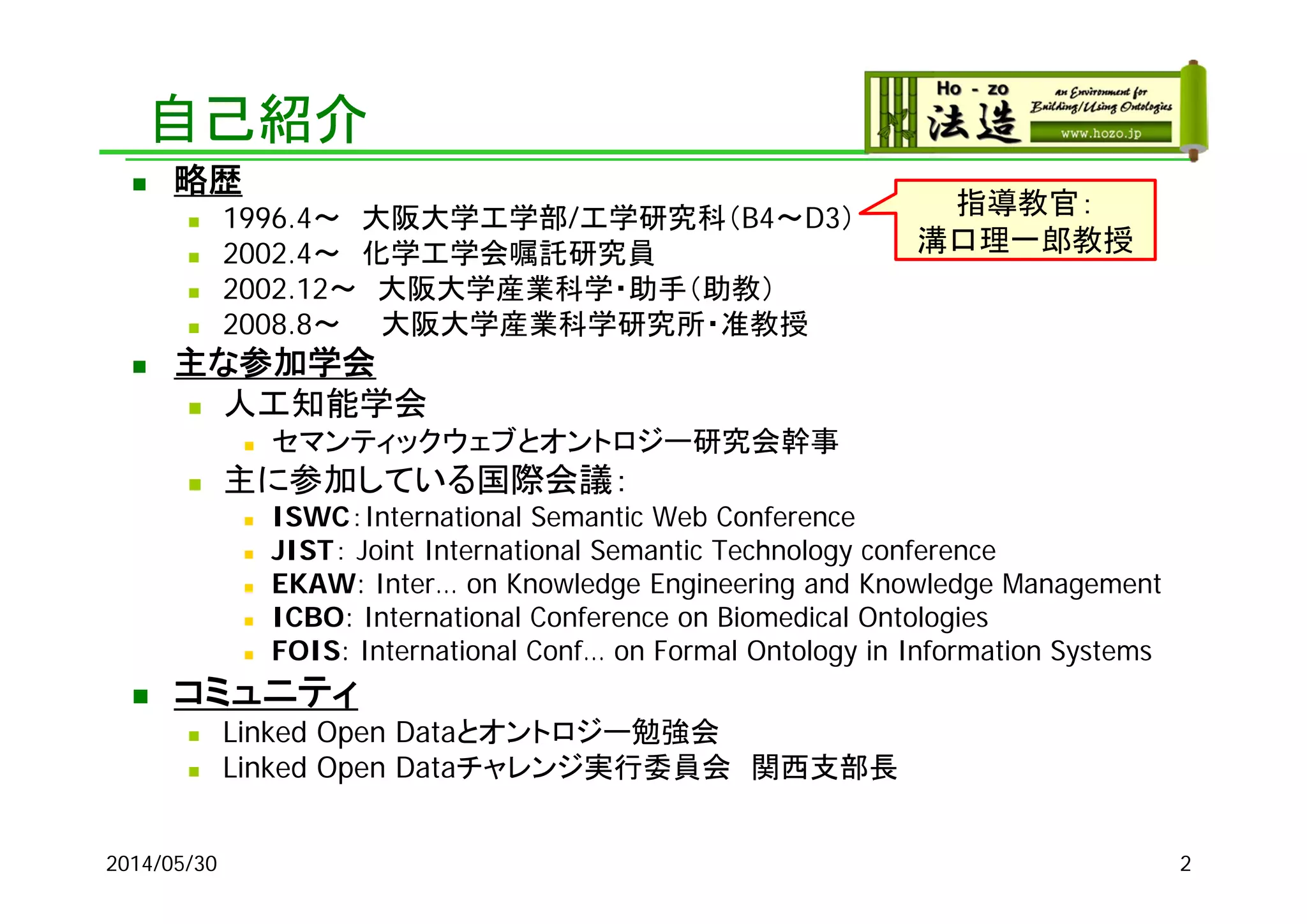 3本柱のそれぞれが,オントロジーの「構築」と「利用」を対象とする. 覚えて頂きたいキーワード オントロジー工学 対象世界を“どのように捉えたか?”を適切に計算機上で表すための技 術を提供する 法造 オントロジー工学の基礎理論に基づいた構築・利用ツール LOD(Linked Open Data) Web上に公開されたデータを相互につなぐ(リンクする)ことにより,新た な価値をもつグローバルなデータとするための技術を提供する 2014/05/30 109