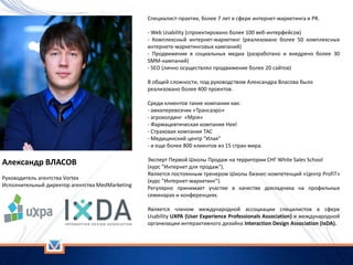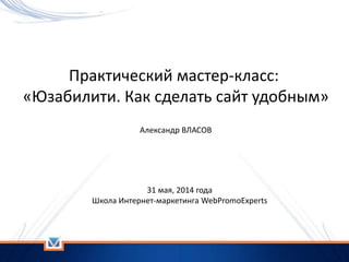 Документ обсуждает практический мастер-класс по юзабилити веб-сайтов, проведенный Александром Власовым, специалистом в интернет-маркетинге с более чем семилетним опытом. В нем рассматриваются принципы проектирования удобной структуры сайта, включая создание древовидной структуры, разработку рабочего и административного меню, а также важность пользовательских сценариев. Также подчеркивается, что универсальные чек-листы для юзабилити неэффективны, и предлагается использовать экспертный подход для анализа и улучшения сайтов.
