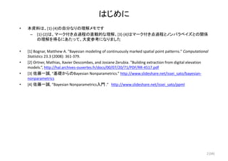 – [1]‐[2]は、マーク付き点過程の直観的な理解、[3]‐[4]はマーク付き点過程とノンパラベイズとの関係