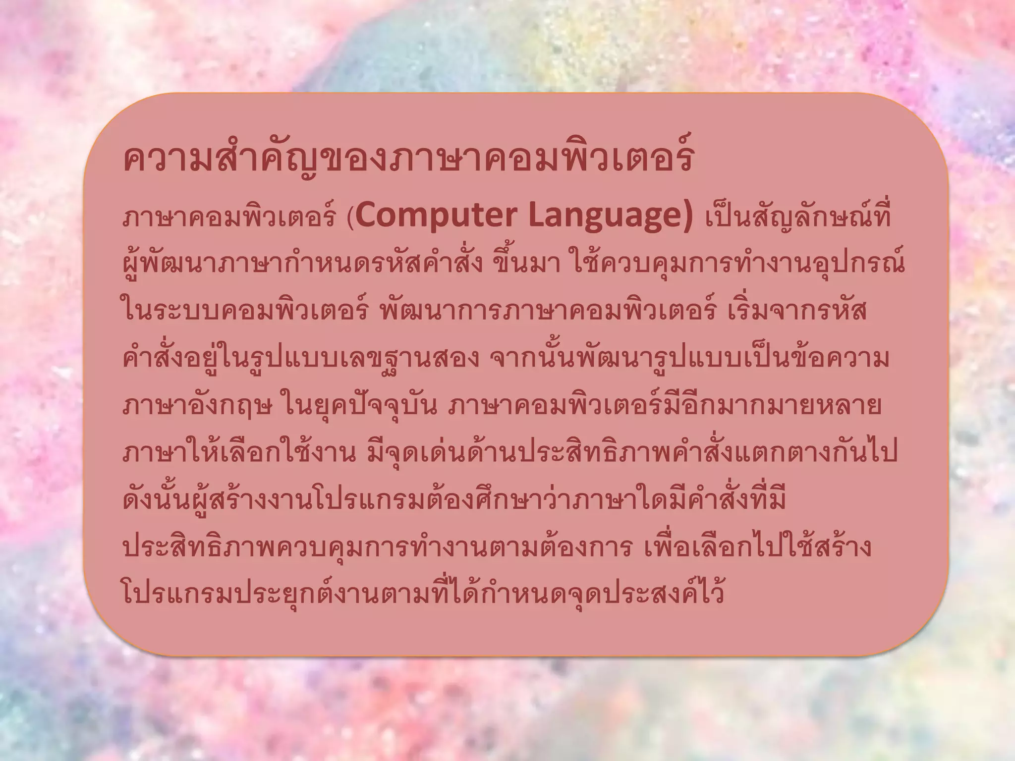ควบคุมการทางาน จึงมีผู้พัฒนารหัสคาสั่งเป็นอักษรภาษาอังกฤษรวมกับเลขฐาน อื่น เช่น เลขฐานสิบหก เพื่อให้เขียนคาสั่งควบคุมงานง่ายขึ้น ตั้งชื่อภาษาว่า แอสแซมบลี หรือภาษาสัญลักษณ์ (Assembly / Symbolic Language) พร้อมกันนี้ต้อง พัฒนาโปรแกรมแปลภาษาขึ้นมาด้วย (Translator Program) คือโปรแกรมแอ สแซมเบลอร์ (Assembler) ใช้แปลรหัสคาสั่งกลับมาเป็นเลขฐานสอง เพื่อให้ระบบ สามารถประมวลผลได้ ช่วงที่ 3 เป็นช่วงที่บริษัทหลายแห่งสร้างภาษาคอมพิวเตอร์หลากหลายภาษา เน้นให้ใช้ งานง่ายขึ้น โดยรหัสคาสั่งเป็นข้อความใกล้เคียงกับภาษาอังกฤษที่ใช้ในการสื่อสารกันอยู่ แล้ว จัดให้เป็นกลุ่ม ภาษาระดับสูง (High Level Language) เช่น ภาษาเบสิก ภาษาปาสคาล ภาษาซี ในส่วนของ โปรแกรมแปลภาษามี 2 ลักษณะ คือ อินเทอรพรีต เทอร์ และคอมไพเลอร์