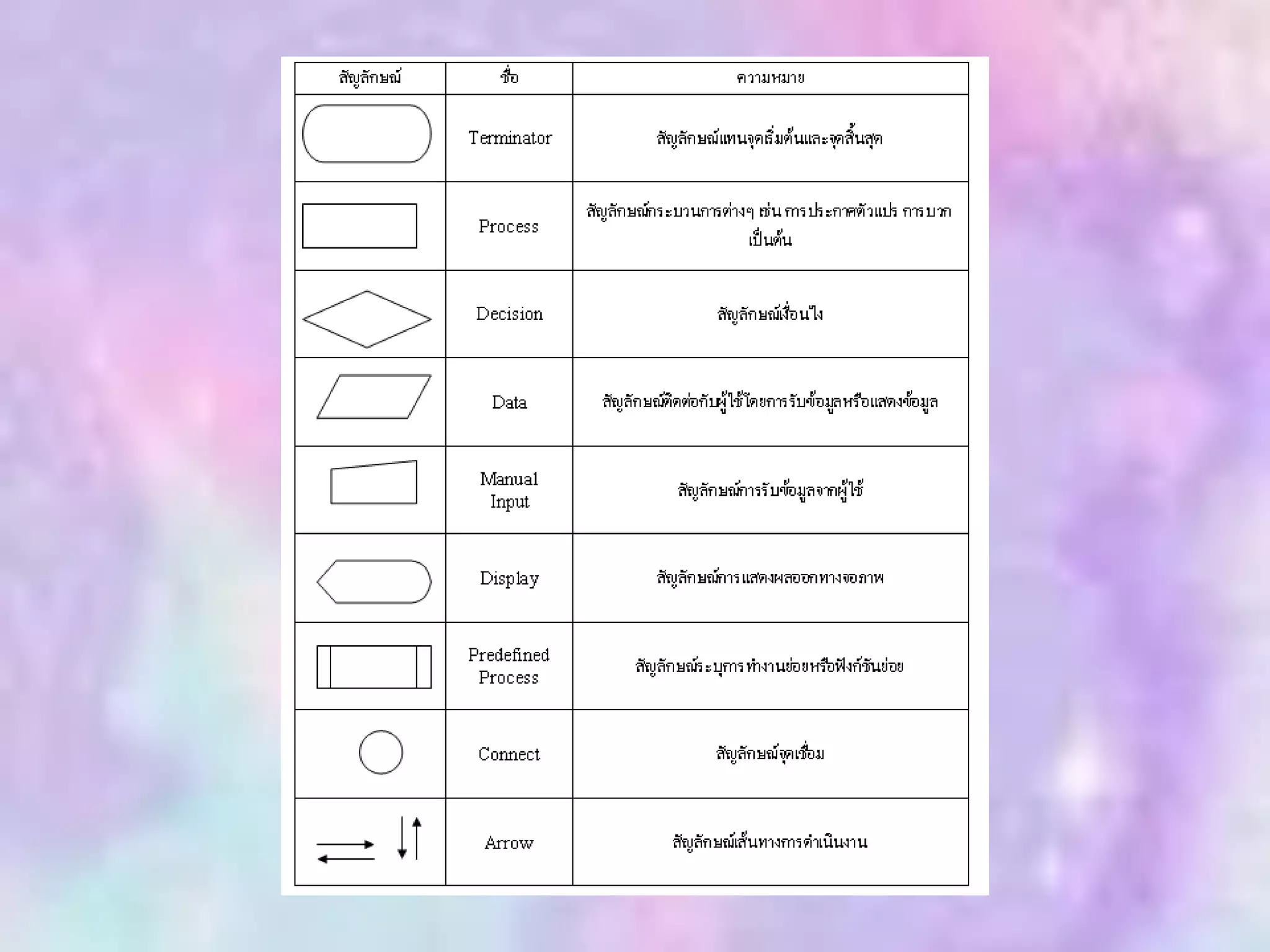ทาให้องเห็นรูปแบบของงานได้ทั้งหมด โดยใช้เวลาไม่มาก 2. การเขียนผังงานเป็นสากล สามารถนาไปเขียนคาสั่งได้ทุก ภาษา 3. สามารถตรวจสอบข้อผิดพลาดของโปรแกรมได้อย่างรวดเร็ว 4. รูปแบบการเขียนผังงาน การเขียนผังงานแสดงลาดับการ ทางานของระบบงานไม่มีรูปแบบการเขียนตายตัว เพราะเป็น เรื่องการออกแบบระบบงานของแต่ละบุคคล ในส่วนนี้เป็นการ นาเสนอรูปแบบการเขียนผังงานโปรแกรม ดังนี้