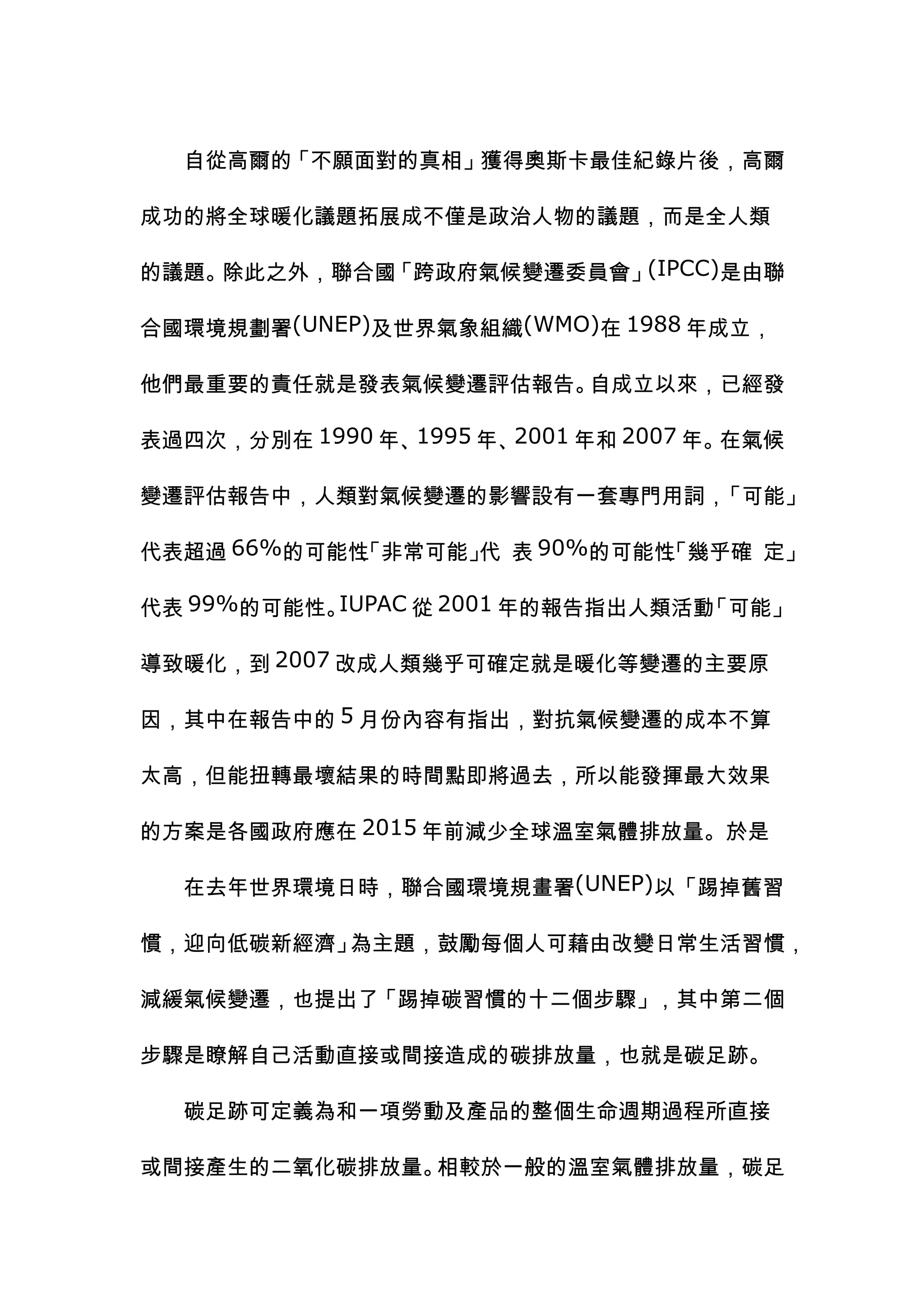 高爾的紀錄片使全球暖化議題普及,引起廣泛關注。聯合國氣候變遷委員會強調人類活動對氣候變遷的影響,並呼籲各國在2015年前減少溫室氣體排放。碳足跡的概念正在全球普及,它涵蓋個人、產品、企業及國家等多層面的排放計算,並鼓勵改善消費習慣以達成減碳目標。