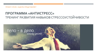 Документ описывает программу 'антистресс', направленную на развитие навыков стрессоустойчивости у работников под давлением. В основе тренинга - соматический подход, включающий практические упражнения для управления состоянием и регулирования стресса. Программа предлагает разные форматы обучения и направлена на улучшение эффективности работы и здоровья участников.