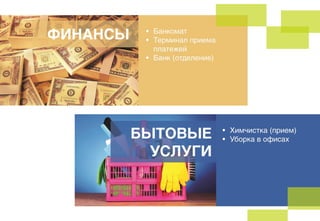 Документ описывает области, связанные с финансированием, работой и технологическими услугами. Основные акценты делаются на общении, консультациях и необходимости быть замеченным в данной сфере. Структура текста предполагает наличие пунктов для обсуждения или активностей.