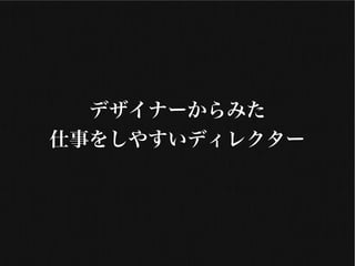 どうすればより パフォーマンスよく動いてくれる? ・お客さんの要望を指示・仕様に変えるのが デザイナーに対するディレクターの仕事 ・指示を行動やヴィジュアルを用いた提案に 変えるのがデザイナーの仕事