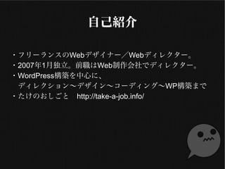 自己紹介 ・フリーランスのWebデザイナー/Webディレクター。 ・2007年1月独立。前職はWeb制作会社でディレクター。 ・WordPress構築を中心に、 ディレクション~デザイン~コーディング~WP構築まで ・たけのおしごと http://take-a-job.info/