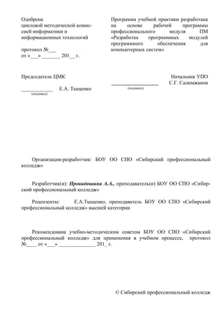 Документ представляет рабочую программу учебной практики по прикладному программированию для студентов среднего профессионального образования в Омске, утвержденную цикловой методической комиссией. Программа направлена на развитие профессиональных и общих компетенций через практическое освоение языков программирования и методологий программирования. Также подробно описаны требования к материально-техническому обеспечению и условия реализации практики в учебных лабораториях.