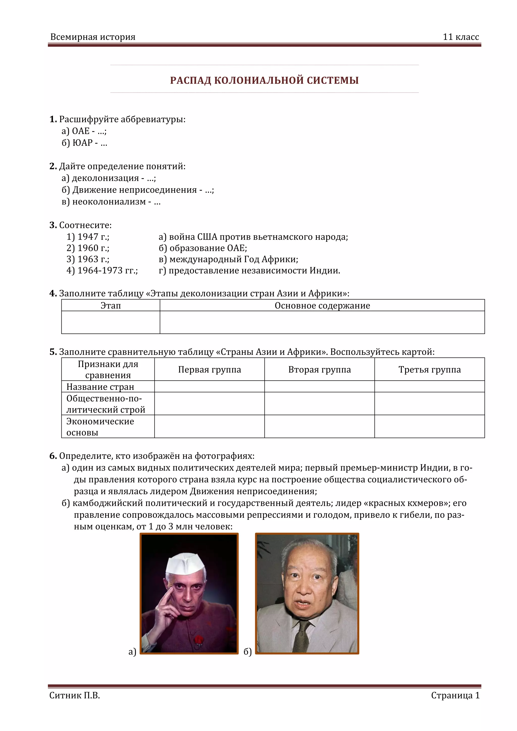 Документ содержит задания для учащихся 11 класса по всемирной истории, касающиеся распада колониальной системы. В нем предлагается расшифровать аббревиатуры, дать определения ключевым понятиям и соотнести исторические события с годовыми датами. Также представлены задания на сравнение стран Азии и Африки и определение известных политических деятелей по фотографиям.
