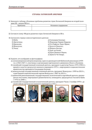 Документ содержит задания для учащихся 11 класса по истории, касающиеся стран Латинской Америки. Задания включают заполнение таблицы с основными проблемами развития, создание схемы моделей развития, соотнесение стран с именами исторических деятелей и определение личностей на фотографиях. Темы охватывают ключевые события и фигуры, такие как Кубинская революция и политические перевороты в Чили и Венесуэле.