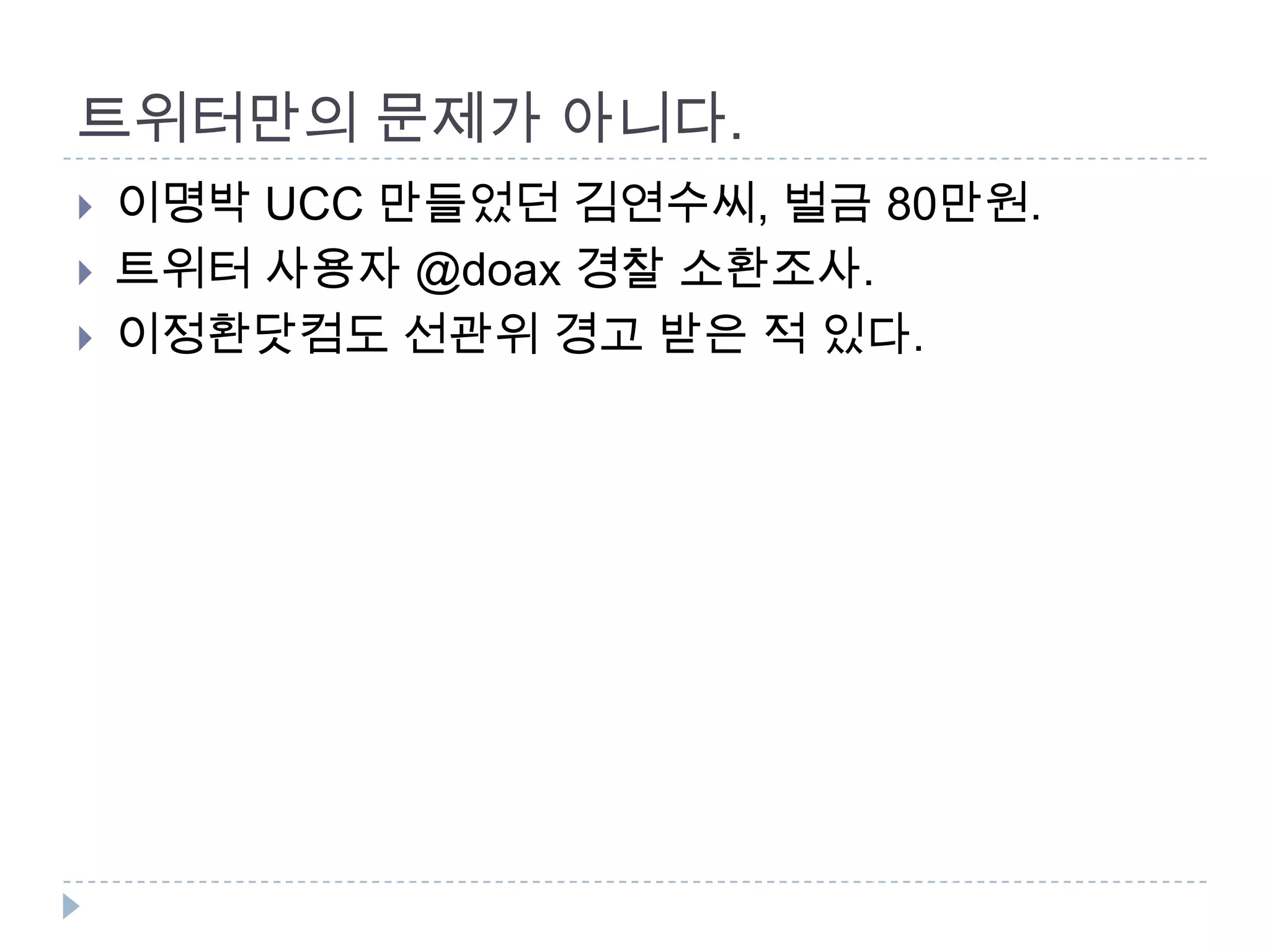표현의 자유, 정치참여의 자유. 선거에 영향을 미치기 위한 행위는 안 된다? 기자들은 되지만 블로거들은 토론회도 안 된다?지지의사를 밝히는 건 되고당선이나 낙선을 위해 활동하면 안 된다? 트위터가 논란인데, 트위터라고 다를 게 없다. 표현의 자유, 정치 참여의 자유 계속 제한돼 왔다. 트위터가 문제가 아니라 표현의 자유, 정치 참여의 자유 문제.