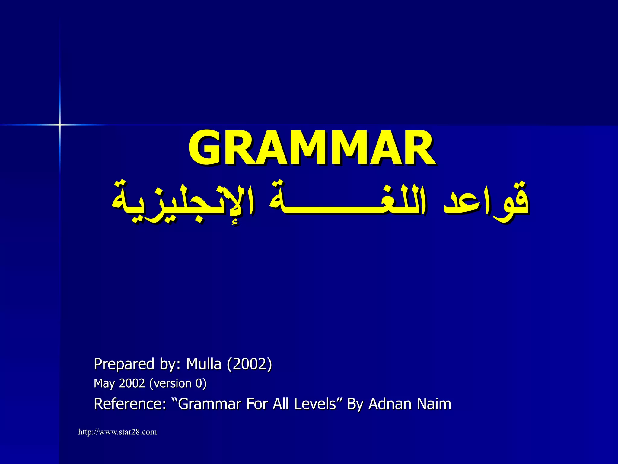 تتناول الوثيقة قواعد اللغة الإنجليزية بما في ذلك أقسام الكلام، أزمنة الأفعال، أدوات التعريف والنكرة، الجمل البسيطة والمعقدة، والأسماء المعدودة وغير المعدودة. تحتوي الوثيقة أيضًا على أمثلة تطبيقية لتكوين الجمل والاستفهام والنفي. تهدف إلى تقديم معلومات شاملة حول القواعد الأساسية للغة الإنجليزية.